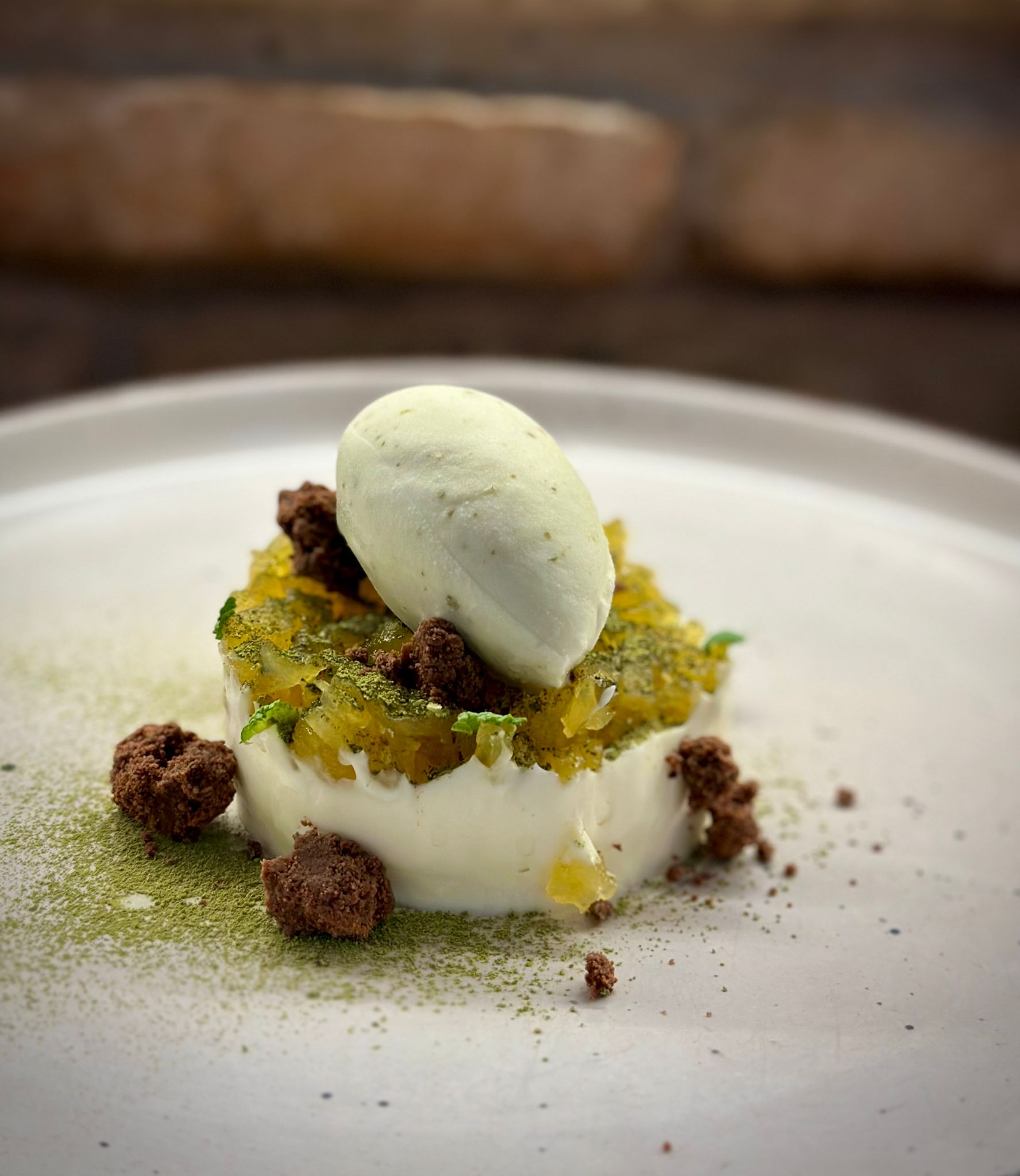 Cremoso de chocolate blanco, tè macha, cacao, chutney de piña y helado de lima kafil